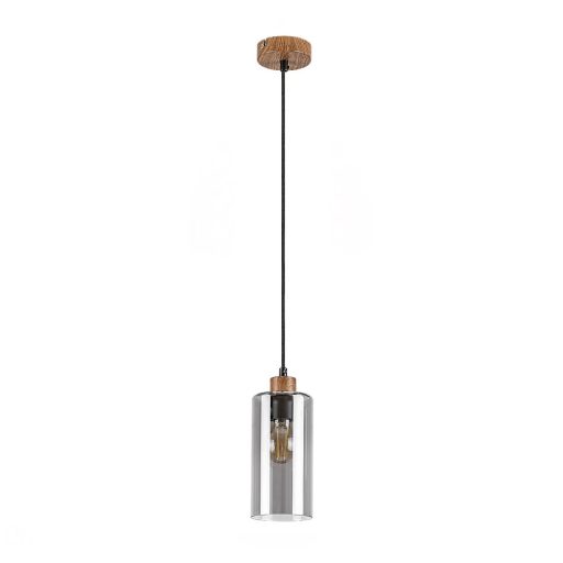 Tölgy színű fém vázas függeszték lámpa henger alakú, füstös üveg búrával, E27-es foglalattal, textil kábellel. A lámpa dekor fényforrással mutat a legjobban, ami nem tartozék.