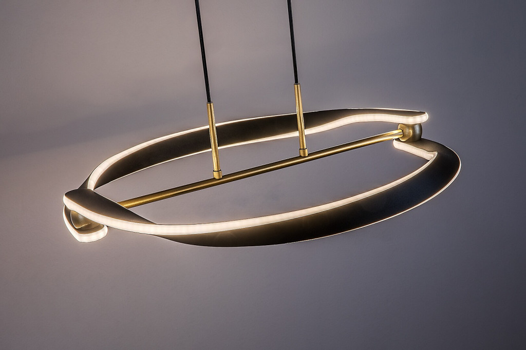 Fekete és arany színű fém függesztett lámpa műanyag betétes búrával, meleg fehér színhőmérsékletű beépített LED fényforrással.