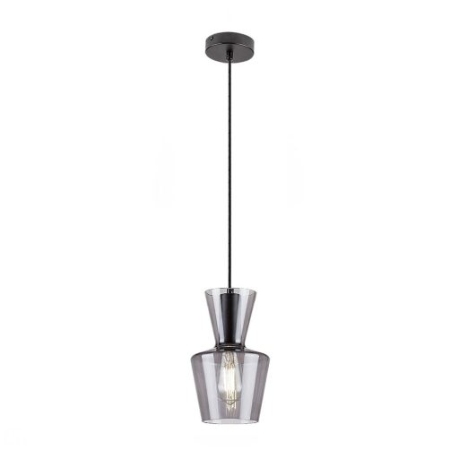 Fekete színű fém vázas függeszték lámpa füstös üveg búrával, E27-es foglalattal.