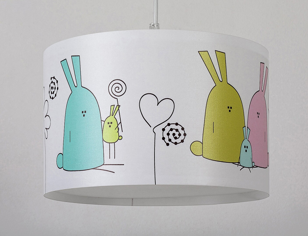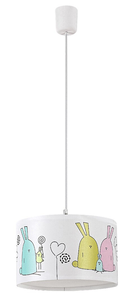 Fehér színű műanyag vázas függeszett lámpa fehér alapon nyuszi család mintás textil búrával, 1db E27-es foglalattal.