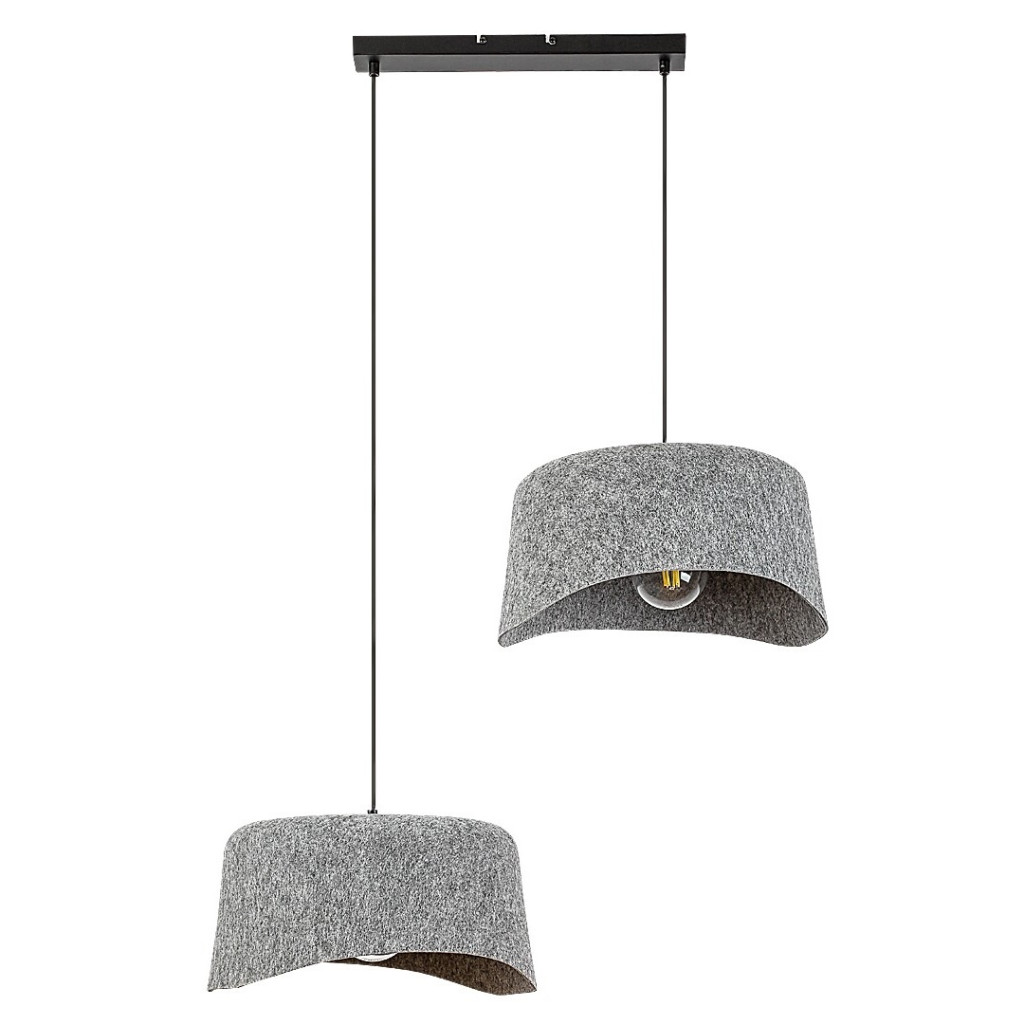 Fekete színű fém vázas függesztett lámpa szürke színű, újrahasznosított filcből készült íves búrával, 2db E27-es foglalattal.