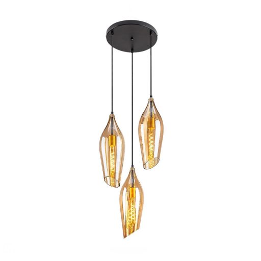 Fekete színű fém vázas függeszték lámpa dekoratív, ferdén vágott borostyán színű üveg búrával, E27-es foglalattal.