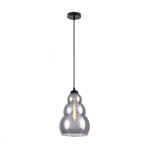 Fekete színű fém vázas függeszték lámpa füstös üveg búrával, E27-es foglalattal.