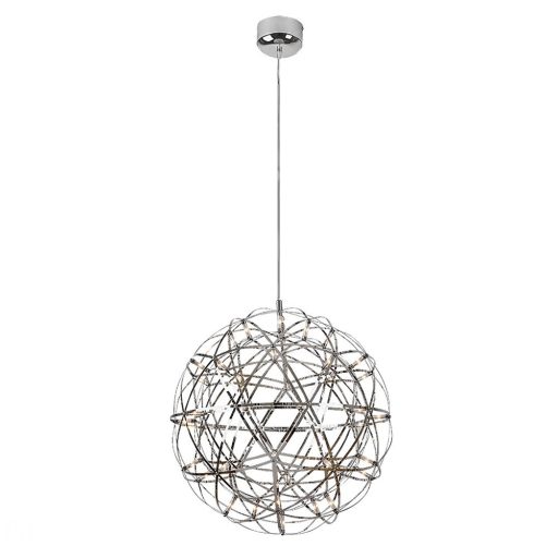 Króm színű fém függesztett lámpa különleg búrával, beépített meleg fehér színhőmérsékletű LED fényforrással.