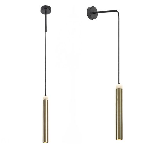 Fekete színű függesztett spot lámpaarany színű cső búrával, természetes fehér színhőmérsékletű beépített LED fényforrással. A lámpa mennyezetről és falról egyaránt függeszthető.