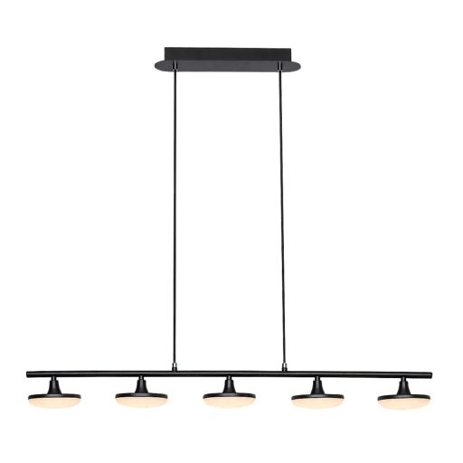 Fekete színű fém vázas függesztett lámpa króm elemekkel, billenthető, műanyag betétes búrával, meleg fehér színhőmérsékletű beépített LED fényforrással. A lámpa belógása felszereléskor 80-150cm között állítható.