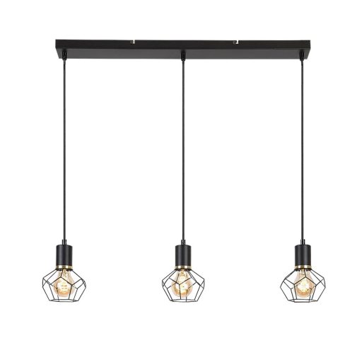 Fekete színű fém függesztett lámpa arany dekoros, fekete rácsos búrával, 3db E27-es foglalattal.