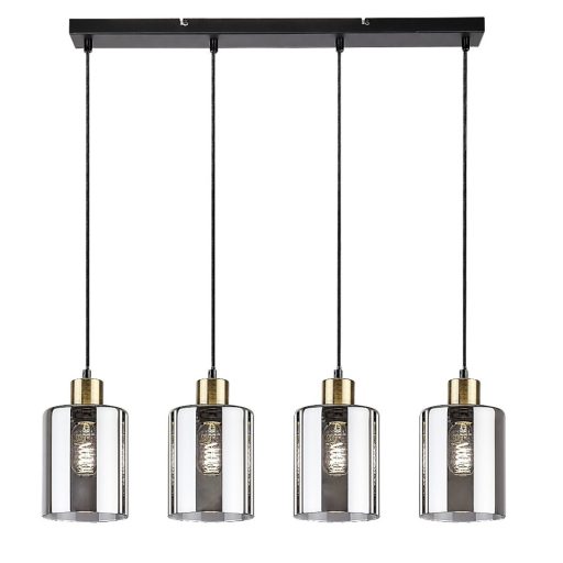 Fekete és arany színű fém vázas függesztett lámpa füstös üveg búrával, E27-es foglalattal.