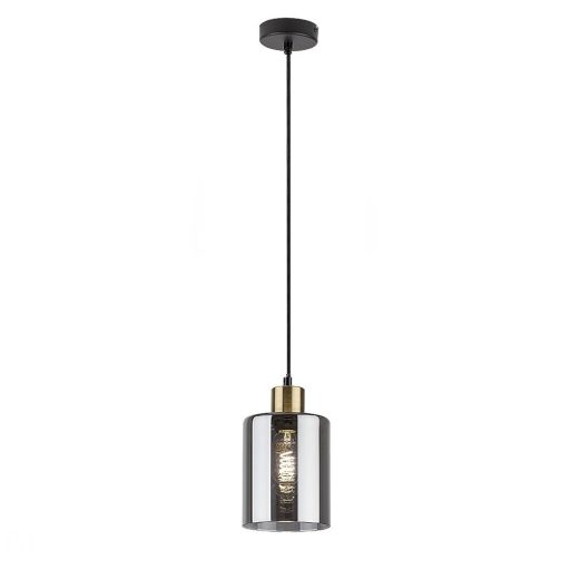 Fekete és arany színű fém vázas függesztett lámpa füstös üveg búrával, E27-es foglalattal.