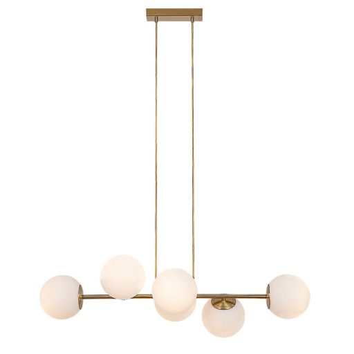 Arany színű fém vázas függesztett lámpa fehér színű, gömb alakú üveg búrával, E27-es foglalattal, textil kábellel. A lámpa búra mérete miatt kisgömb(G45) fényforrás fér a lámpába, ami nem tartozék.