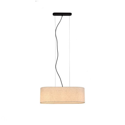 Matt fekete színű fém vázas függesztett lámpa bézs színű textil lámpaernyővel, 3db E27-es foglalattal.