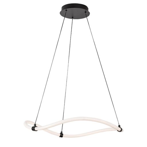 Fekete színű fém függesztett lámpa fehér színű műanya cső búrával, természetes fehér színhőmérsékletű beépített LED fényforrással. A lámpa belógása felszereléskor 40-150cm között állítható.