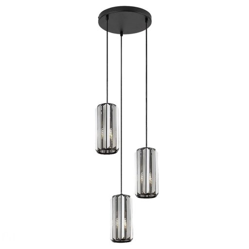 Matt fekete színű fém vázas függesztett lámpa füstös kristály búrával, E27-es foglalattal.