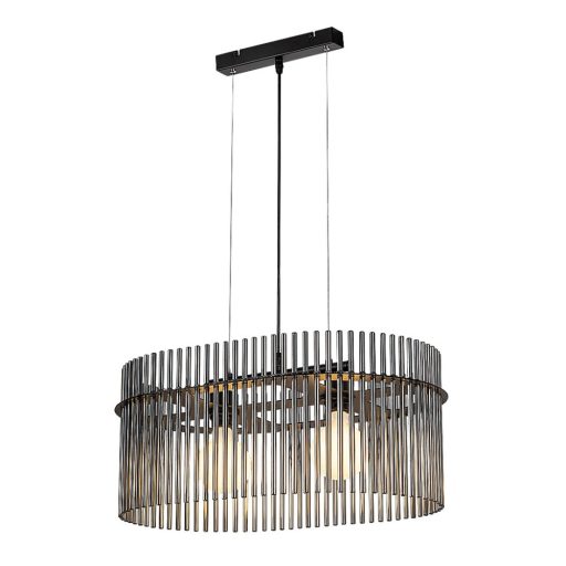 Fekete színű fém vázas függeszett lámpa füstös üveg rudakkal körbe rakott, ovális búrával, 2db E27-es foglalattal. A lámpa belógása felszereléskor 100-150cm között állítható.