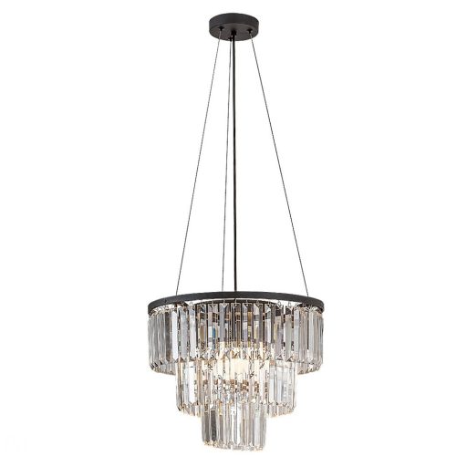 Fekete színű fém vázas függesztett lámpa üveg kristály rudakkal körbe rakott búrával, 3db E27-es foglalattal.