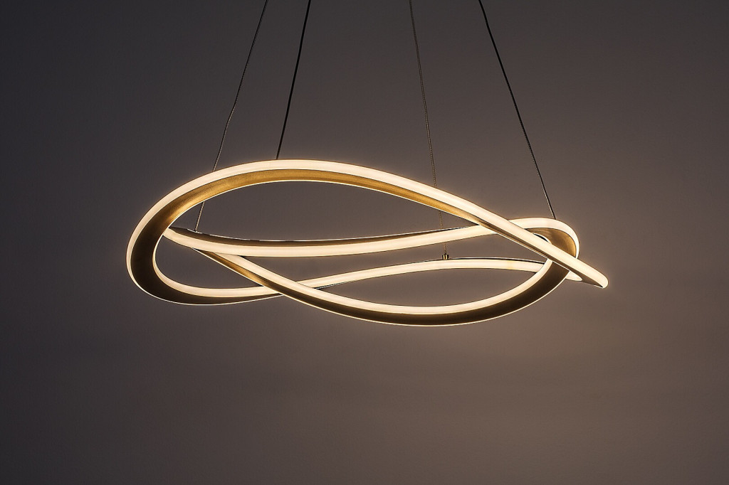 Arany színű fém vázas függesztett lámpa, ívelt, fehér szilikon betétes búrával, meleg fehér színhőmérsékletű beépített LED fényforrással.
