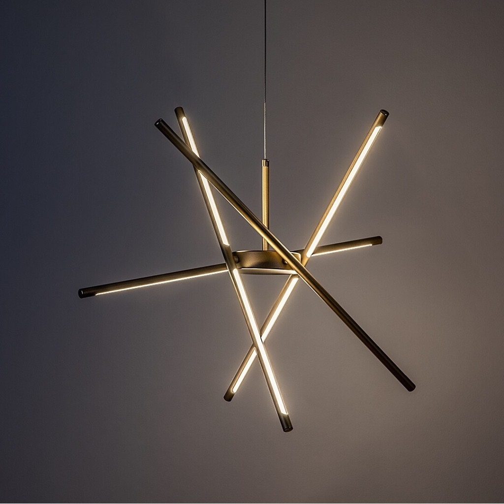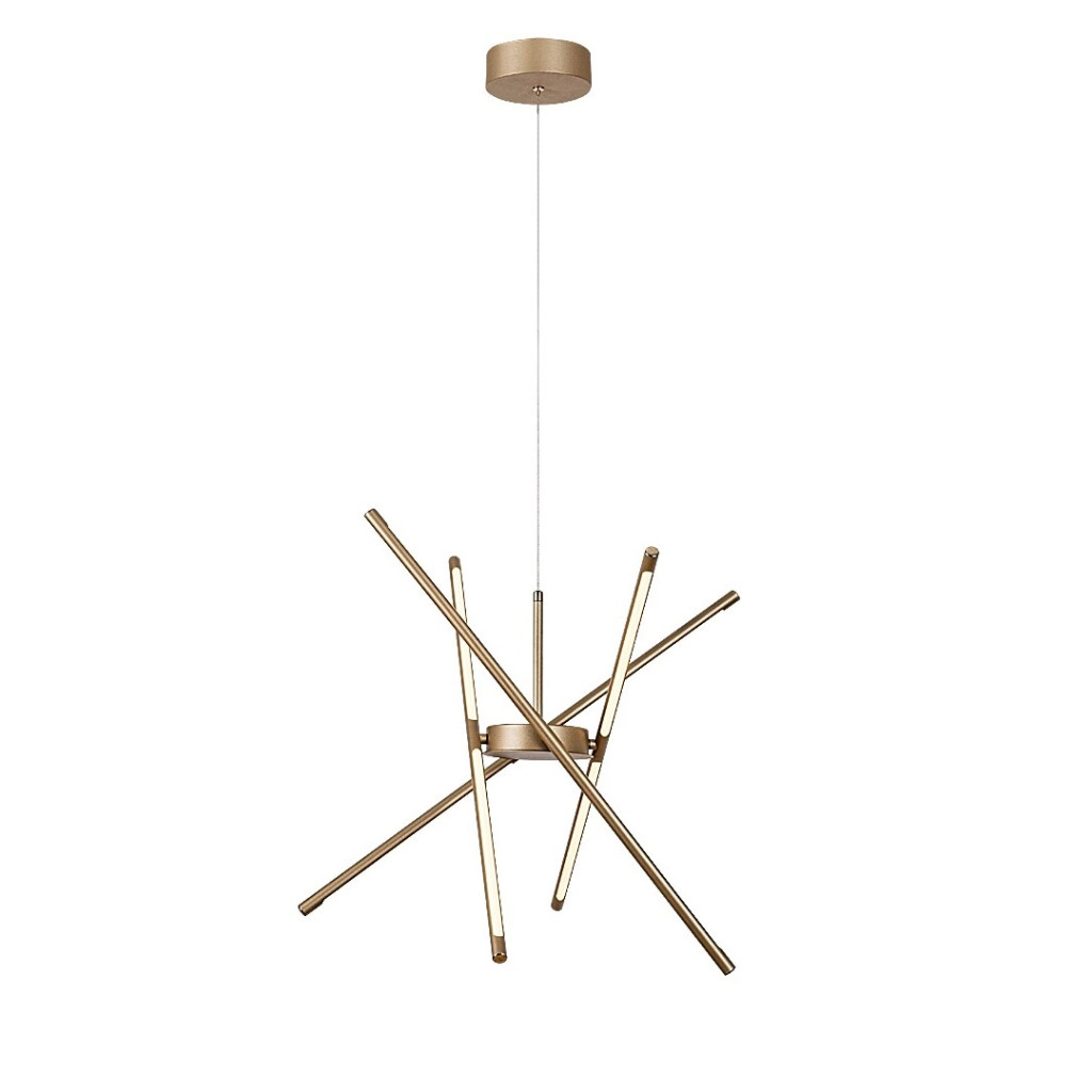 Arany színű fém vázas függesztett lámpa fehér műanyag betétes búrával, meleg fehér színhőmérsékletű beépített LED fényforrással, felszereléskor 40-150cm között állítható belógással.