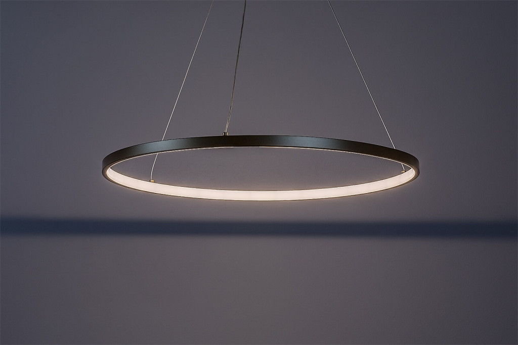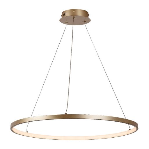 Arany színű fém vázas függesztett lámpa gyűrű alakú, szilikon betétes búrával, meleg fehér színhőmérsékletű beépített LED fényforrással.