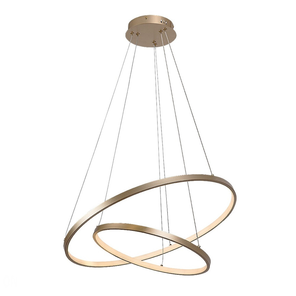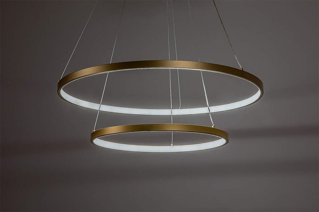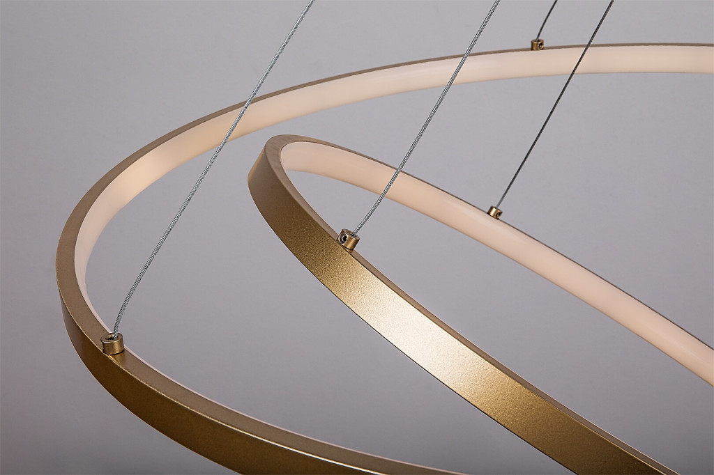 Arany színű fém vázas függesztett lámpa gyűrű alakú, szilikon betétes búrával, beépített LED fényforrással. A lámpához távirányító tartozik, mely segítségével állítható a LED fényereje, a színhőmérséklete (3000-6500K, azaz melegtől-hideg fehér). Szintén a távirányítóval kapcsolható éjszakaia fény funkióval is rendelkezik.