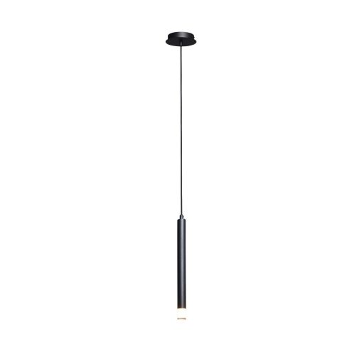 Fekete színű fém vázas függesztett lámpa a cső végén áttetsző acryl búrával, G9-es foglalattal.