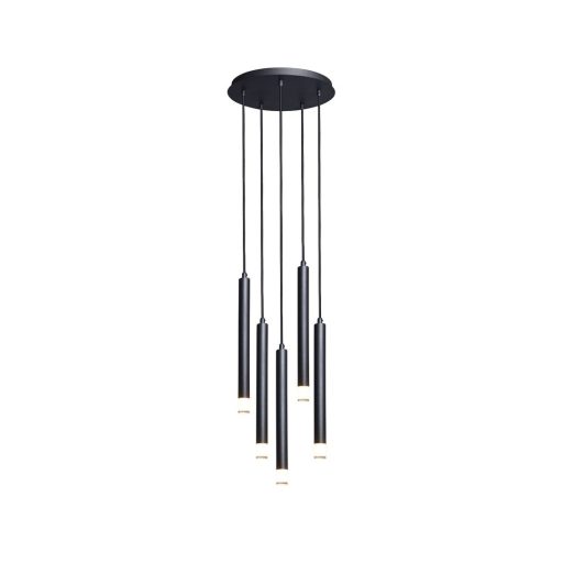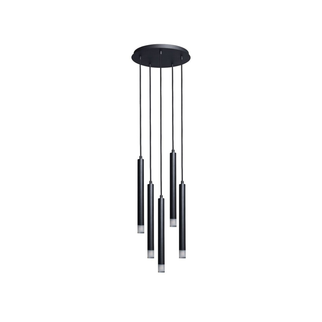 Fekete színű fém vázas függesztett lámpa a csőszerű ágak végén áttetsző acryl búrával, G9-es foglalattal.