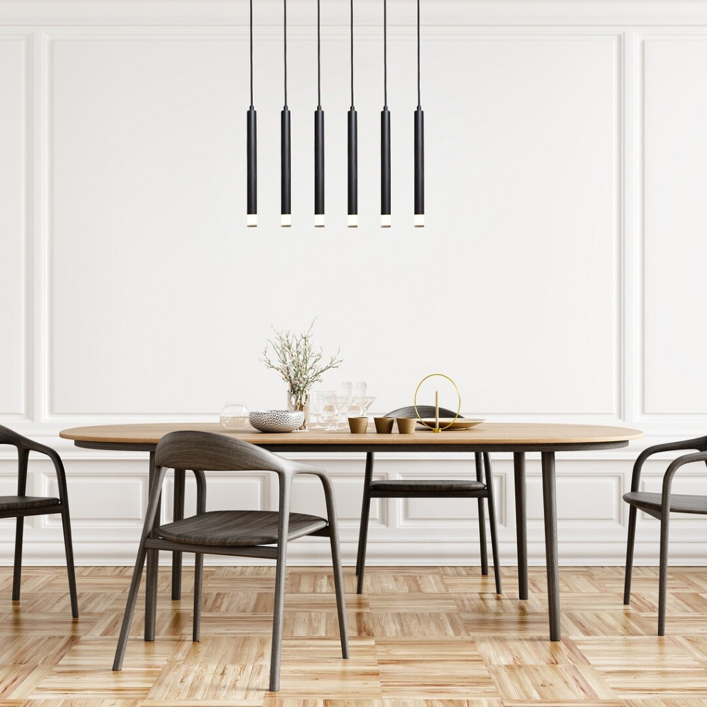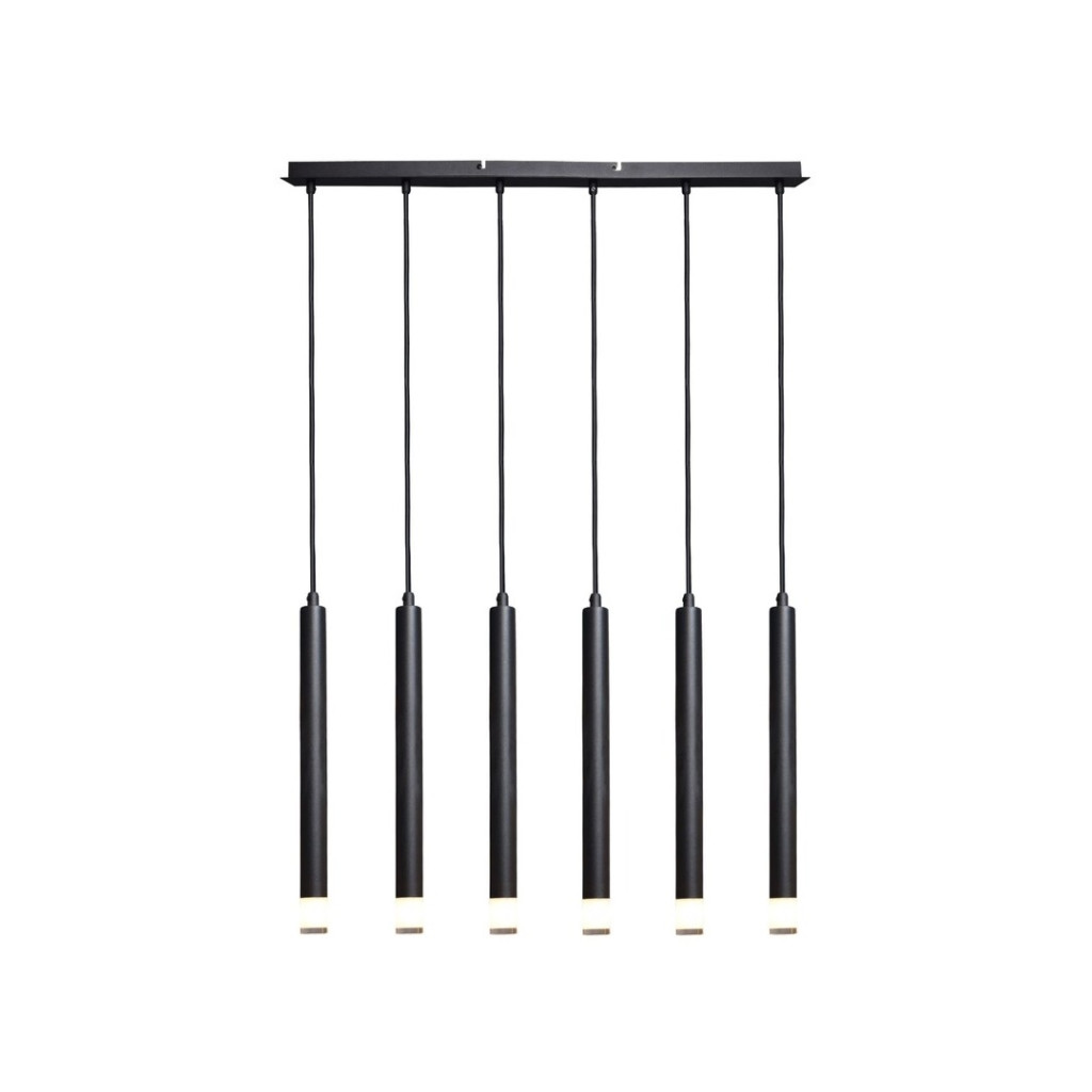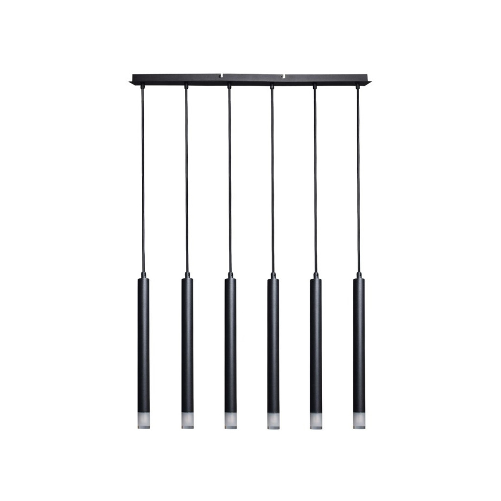 Fekete színű fém vázas függesztett lámpa a csőszerű ágak végén áttetsző acryl búrával, G9-es foglalattal.