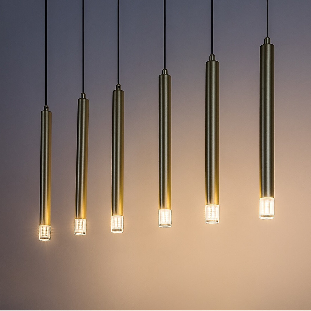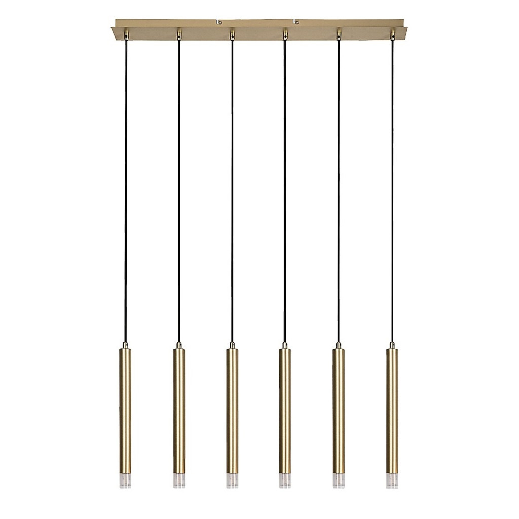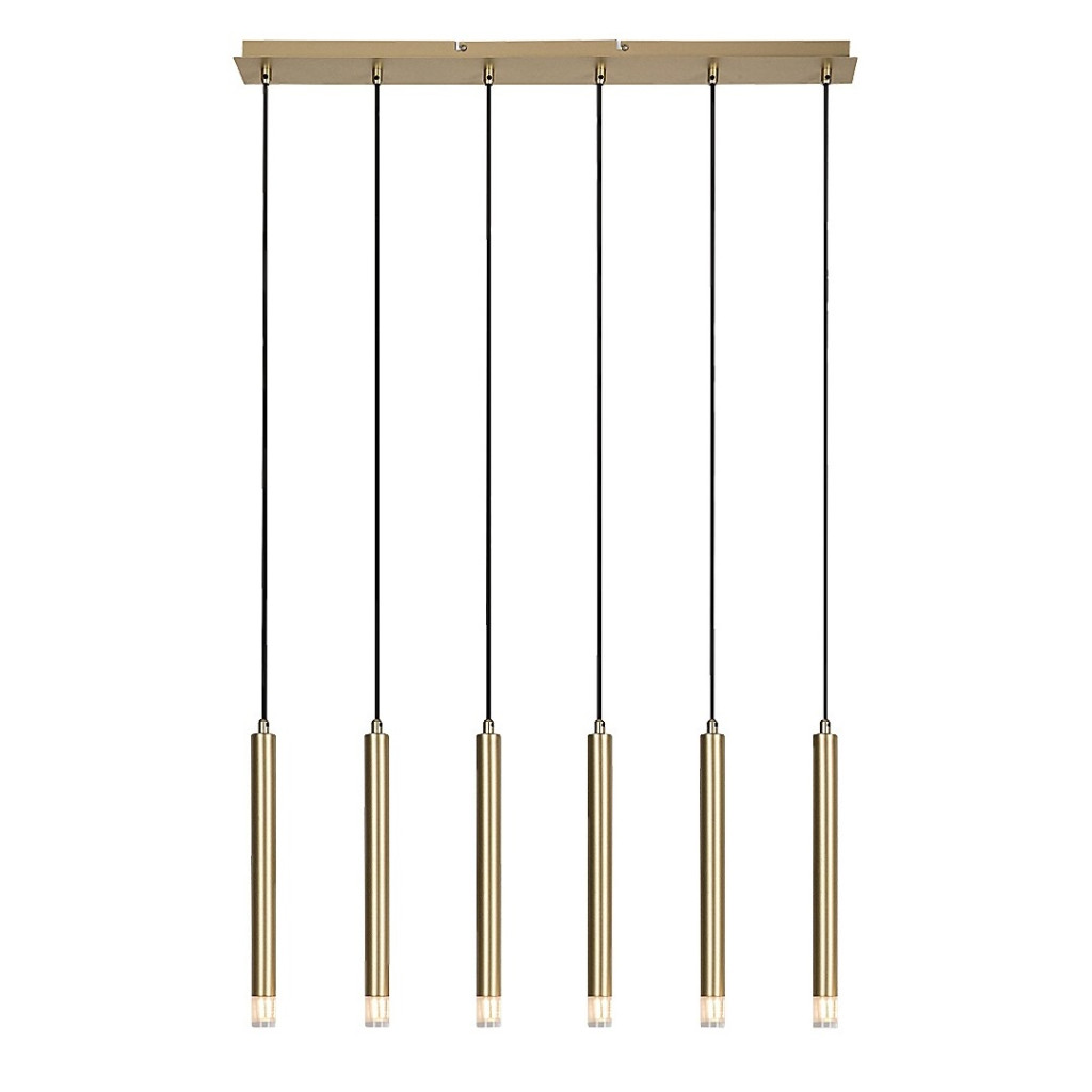 Arany színű fém vázas függesztett lámpa a csőszerű ágak végén áttetsző acryl búrával, G9-es foglalattal.