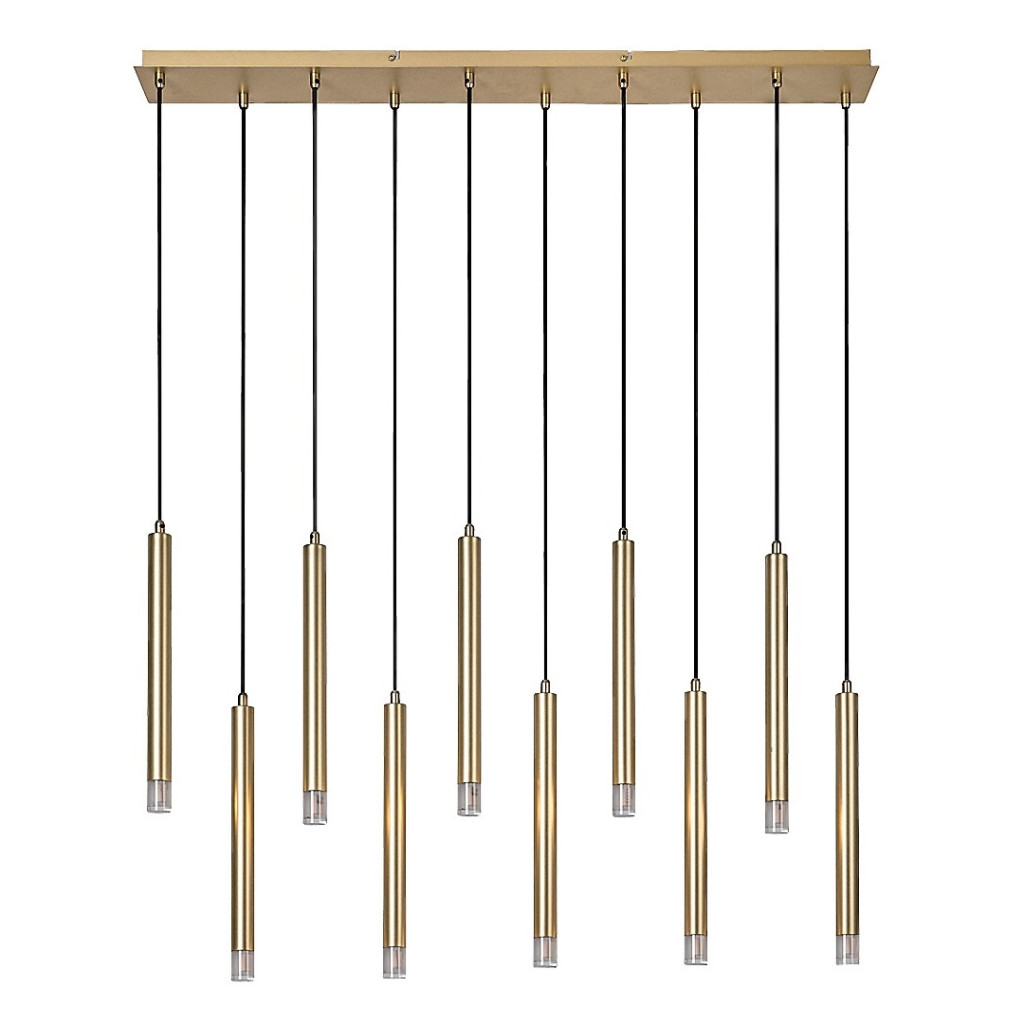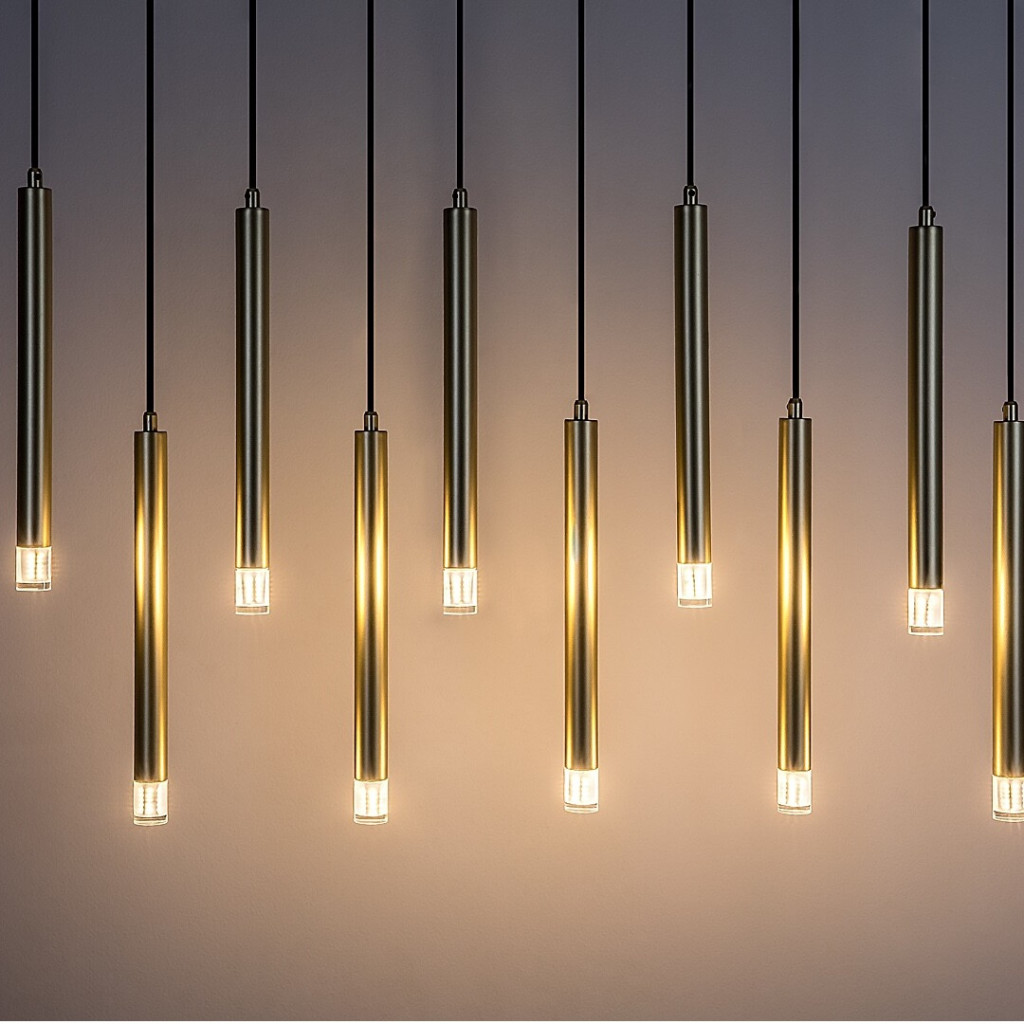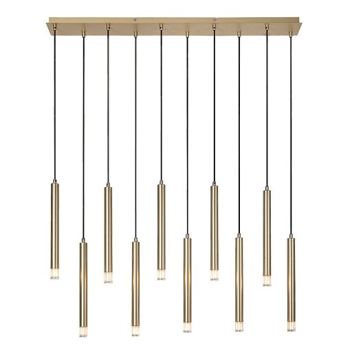 Arany színű fém vázas függesztett lámpa a csőszerű ágak végén áttetsző acryl búrával, G9-es foglalattal.