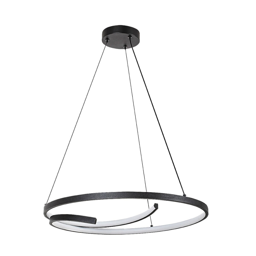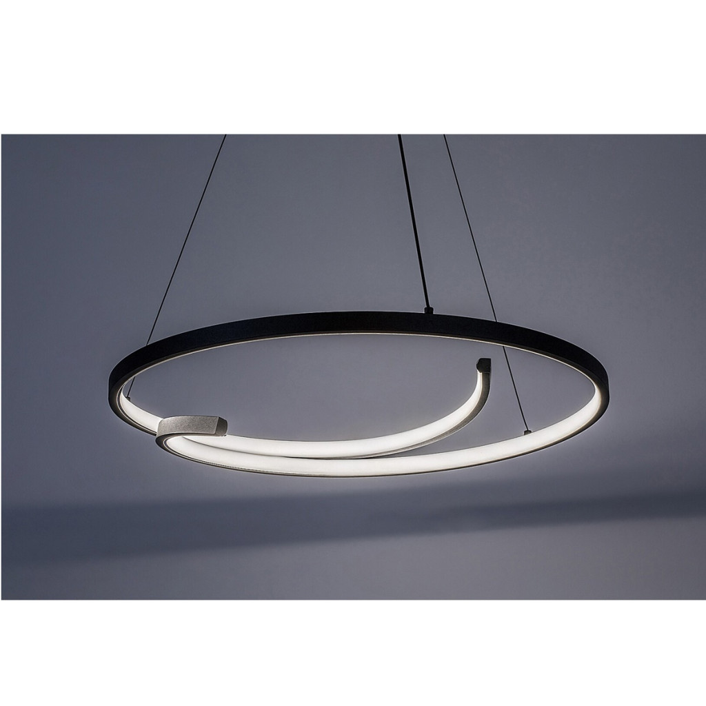 Fekete színű fém vázas függesztett lámpa 55cm átmérőjű, gyűrű alakban kanyargó, fehér műanyag betétes búrával, természetes fehér színhőmérsékletű beépített LED fényforrással.