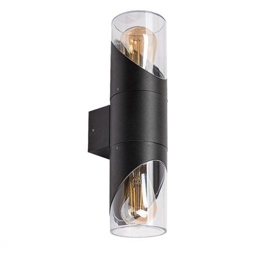 Fekete színű fém vázas kültéri mennyezeti lámpa átlátszó műanyag búrával, 2db E27-es foglalattal, IP54-es védelemmel. A lámpát fényforrás nélkül szállítjuk. A képen Edison dekor fényforrással látható.