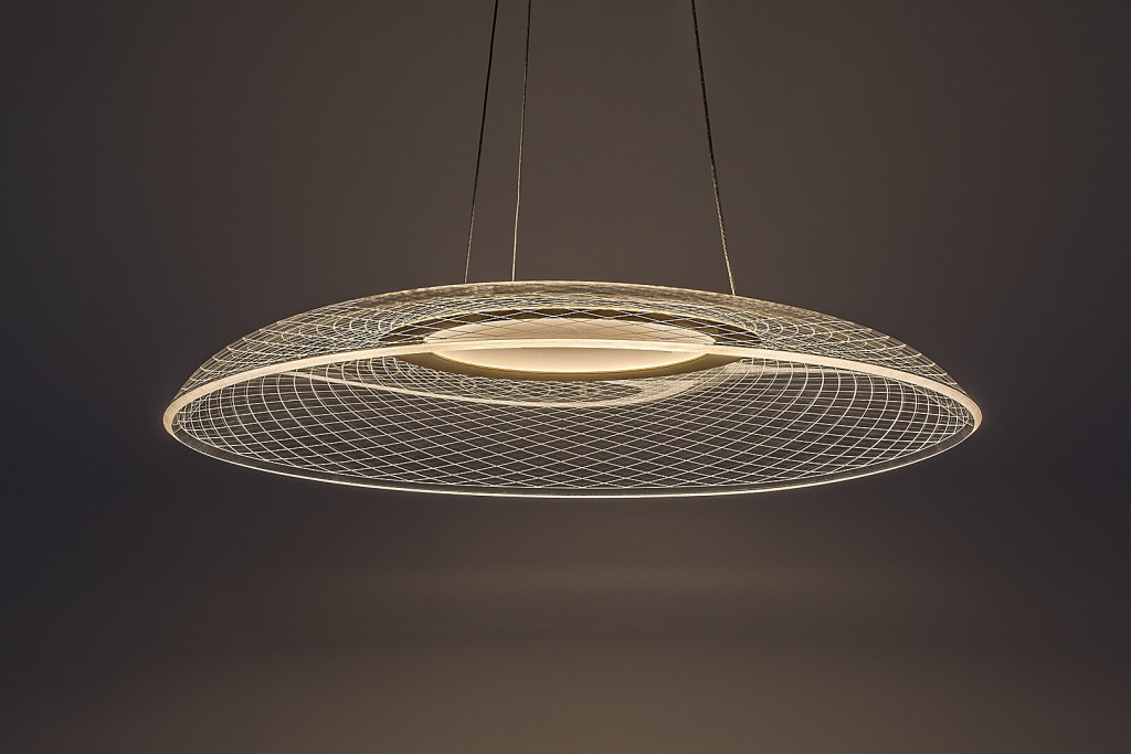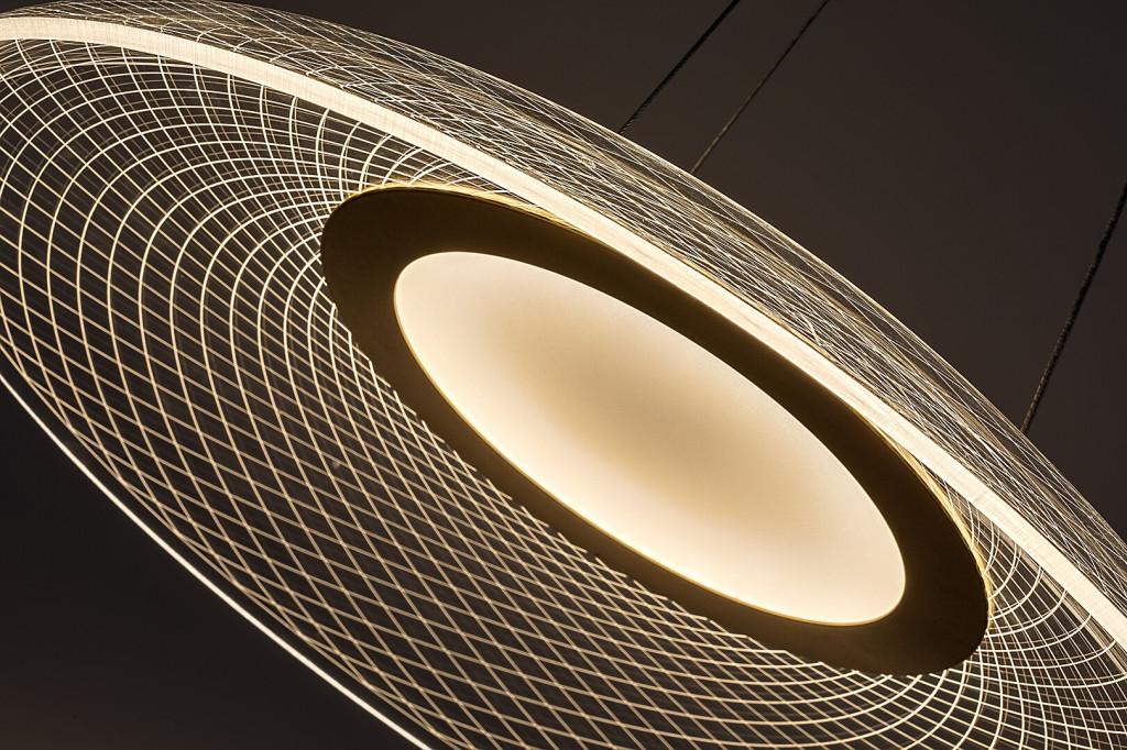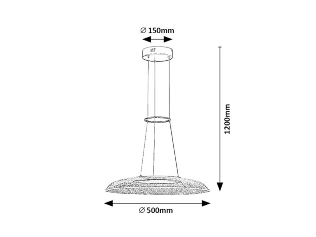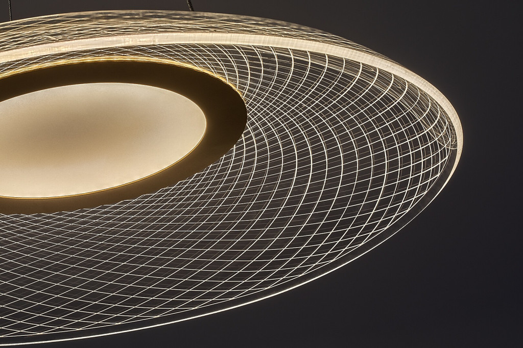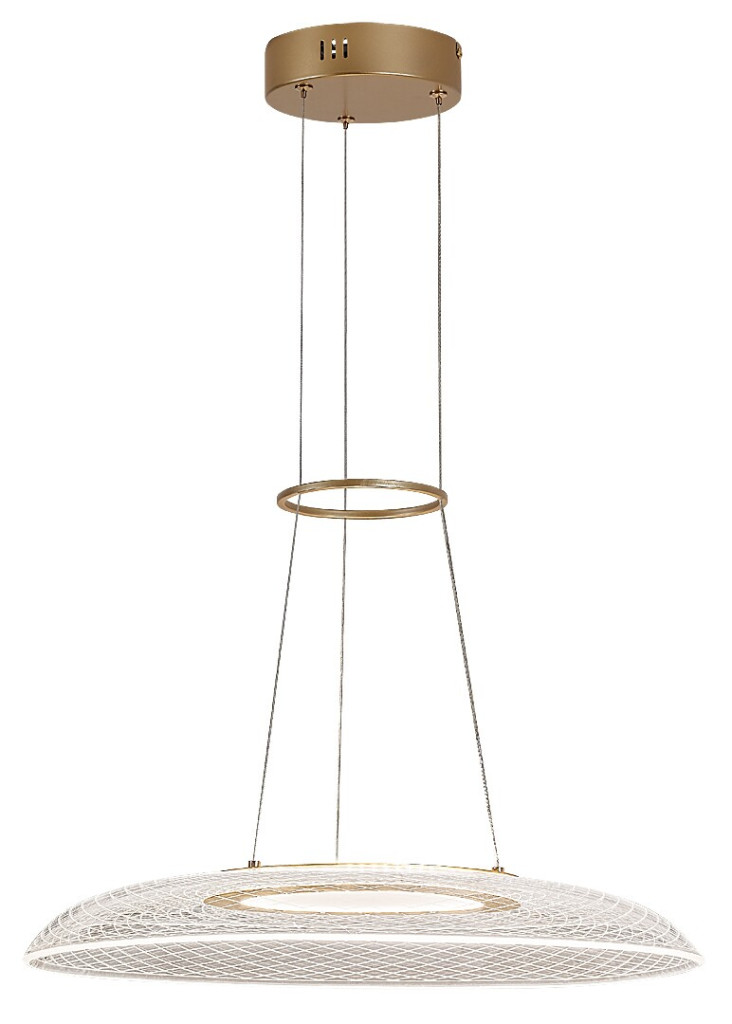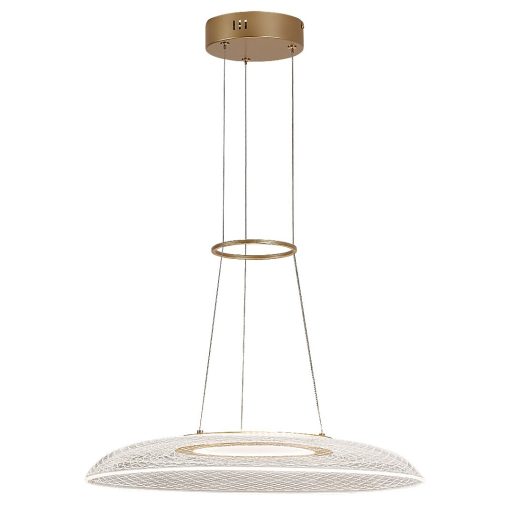 Arany színű fém vázas függesztett lámpa, légies, átlátsző acryl búrával, melynek gravírozott, rácsos mintája felkapcsoláskor világít. A lámpa meleg fehér színhőmérsékletű beépített LED fényforrással rendelkezik.