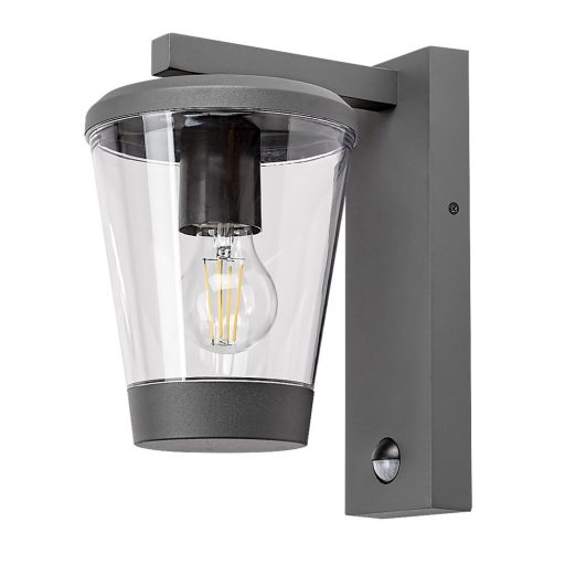 Antracit színű fém kültéri mozgás-érzékelős fali lámpa átlátszó műanyag betétes búrával, 1db E27-es foglalattal, IP44-es védelemmel. A lámpát fényforrás nélkül szállítjuk.