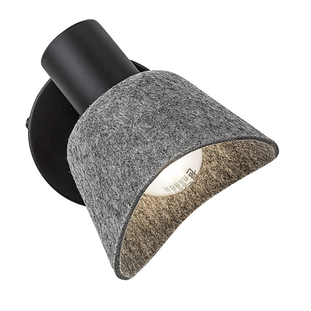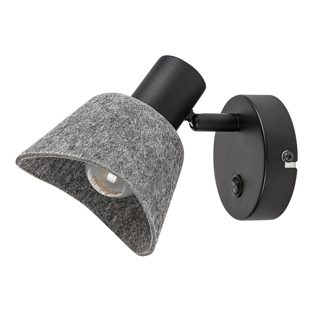 Fekete színű fém vázas spot lámpa szürke színű, újrahasznosított filcből készült íves búrával, billenthető fejjel, E14-es foglalattal, lámpatesten elhelyezett kapcsolóval.