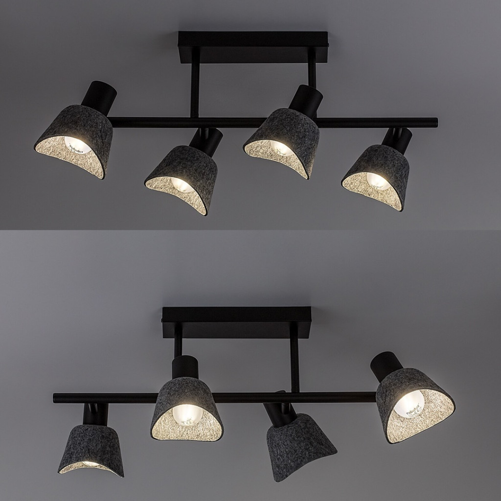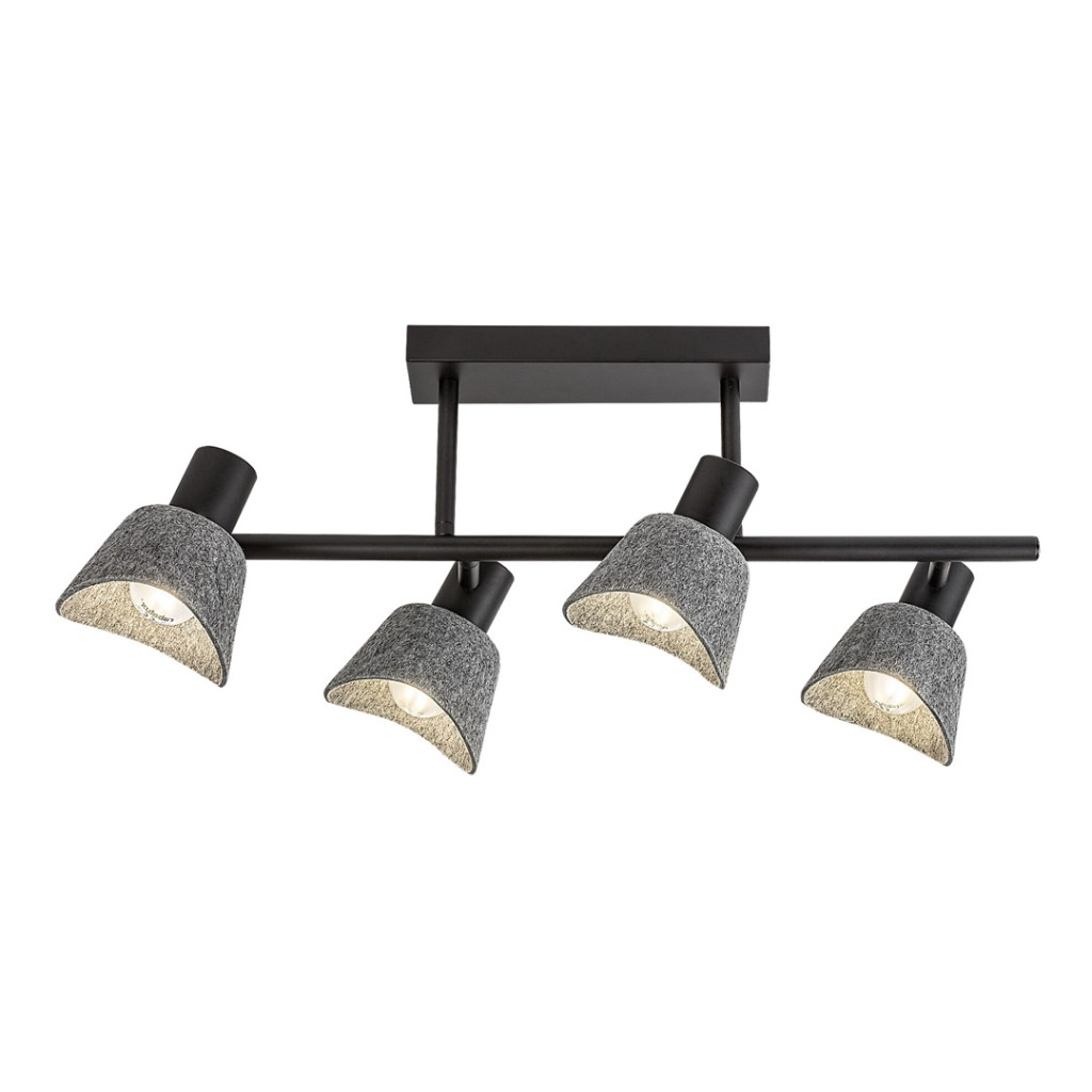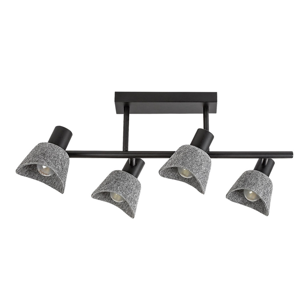 Fekete színű fém vázas mennyezeti lámpa szürke színű, újrahasznosított filcből készült íves búrával, billenthető fejjel, E14-es foglalattal.
