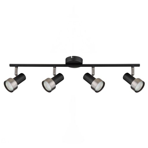 Matt fekete színű fém spot lámpa ezüst gyűrű dekorral, állítható fejjel, GU10-es foglalattal. A lámpát fényforrás nélkül szállítjuk.