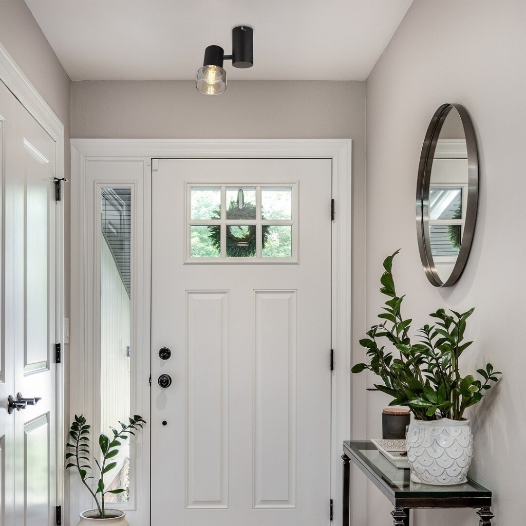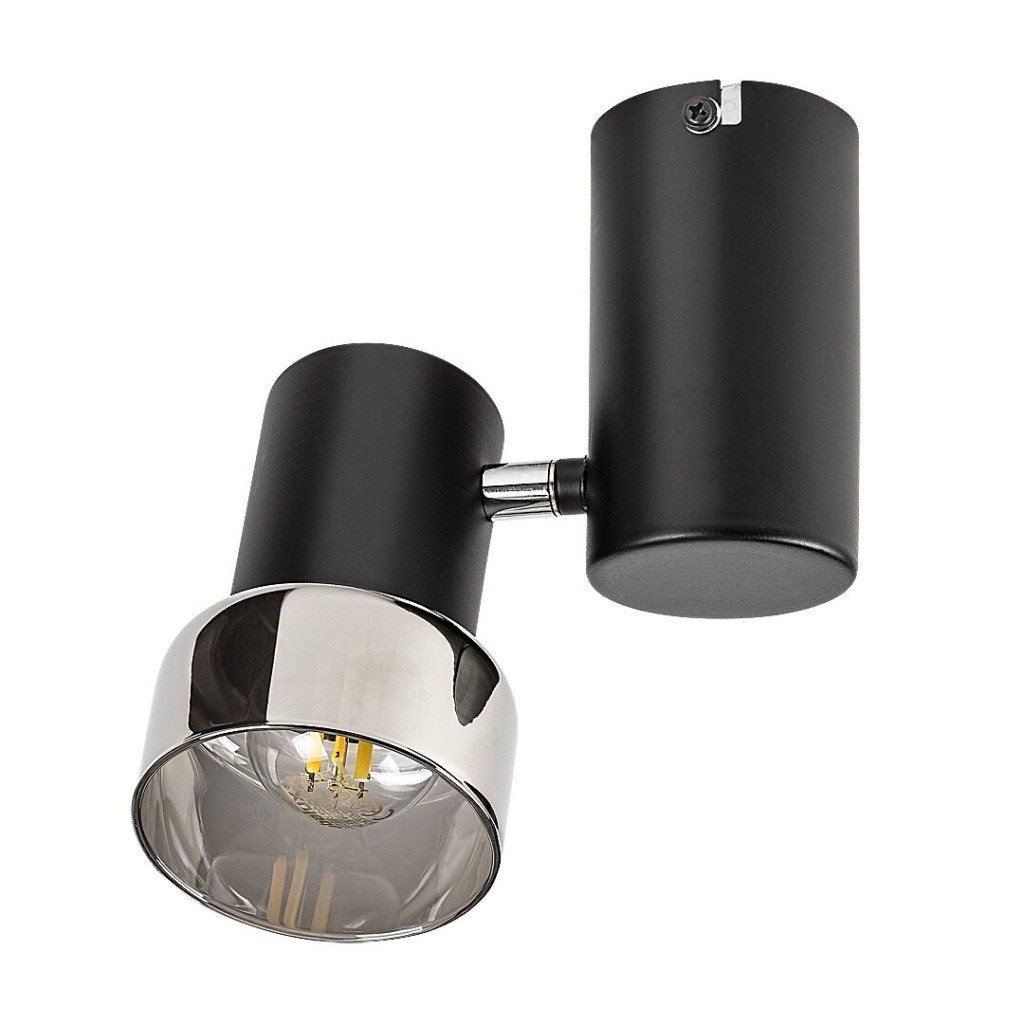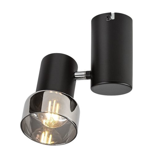 Fekete színű fém spot lámpa füstszínű üveg búrával, állíhtató fejjel, vezetékre szerelt kapcsolóval, E14-es foglalattal.