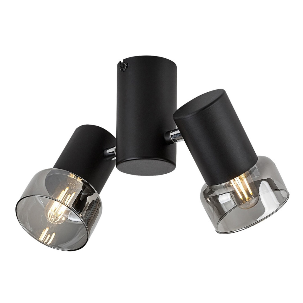 Fekete színű fém spot lámpa füstszínű üveg búrával, állíhtató fejjel, vezetékre szerelt kapcsolóval, E14-es foglalattal.