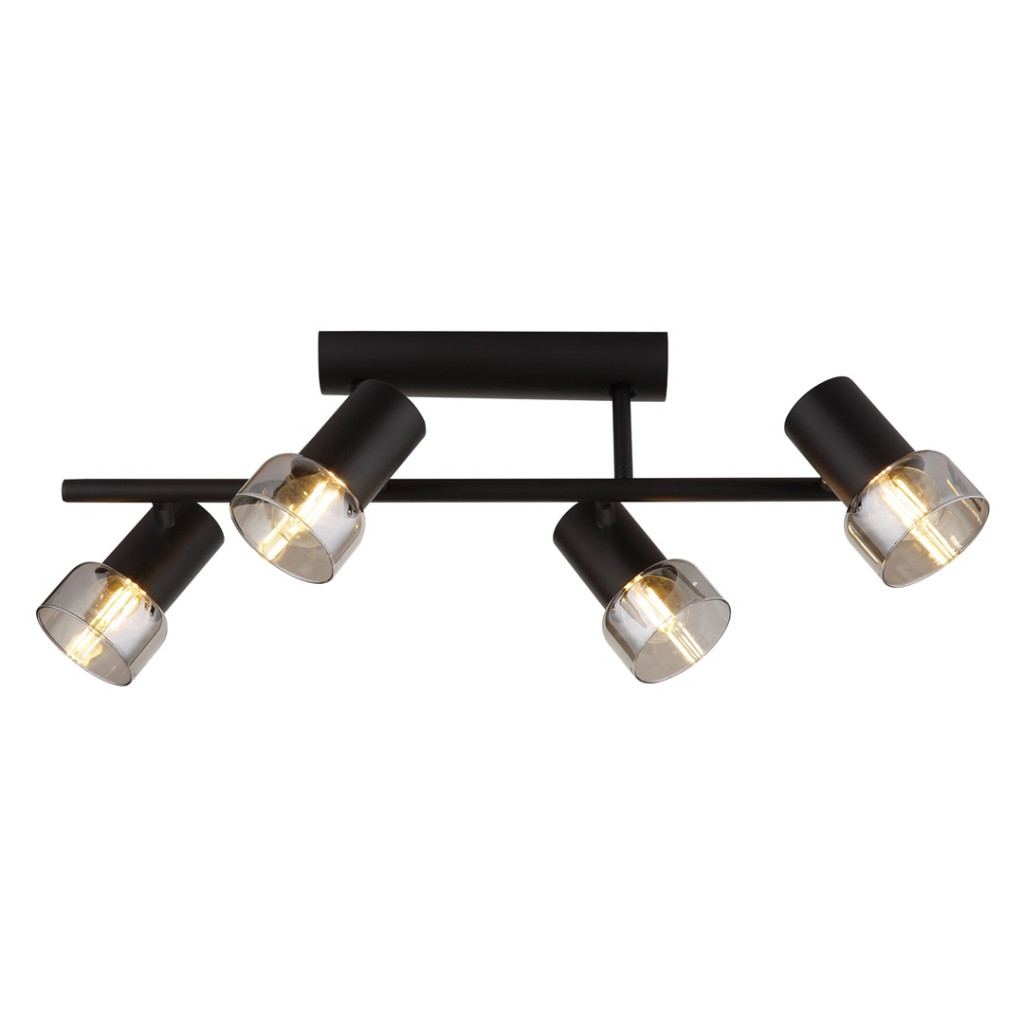 Fekete színű fém mennyezeti lámpa füstszínű üveg búrával, állíhtató fejjel, vezetékre szerelt kapcsolóval, E14-es foglalattal.