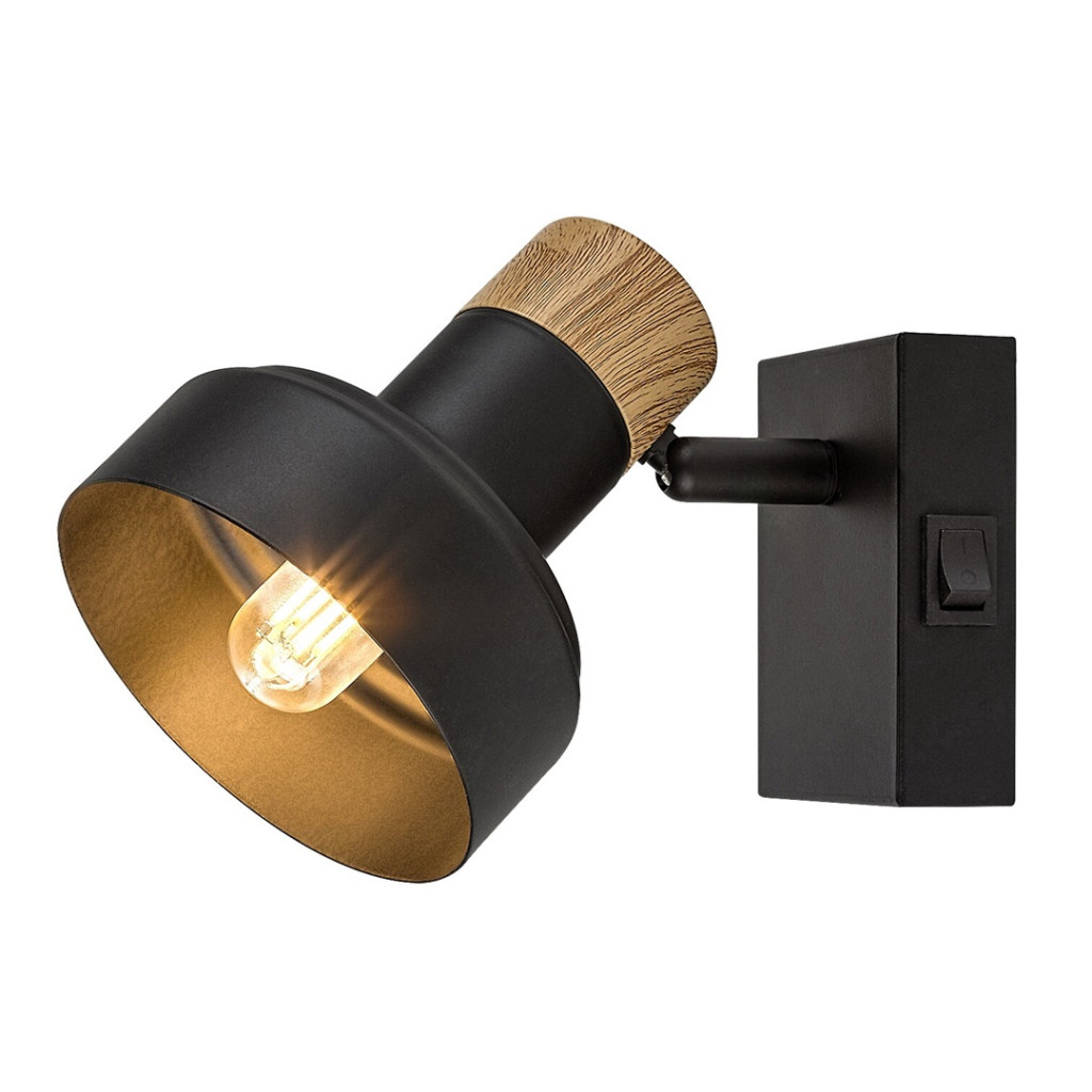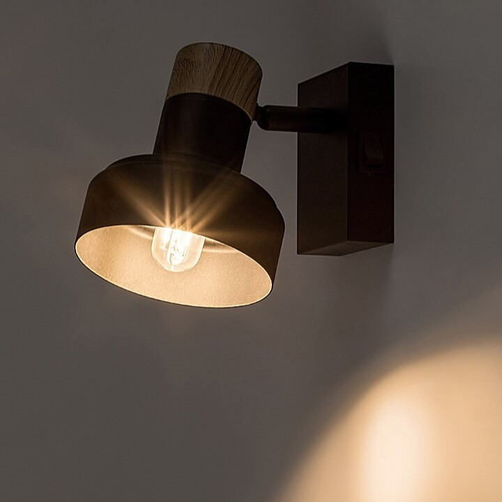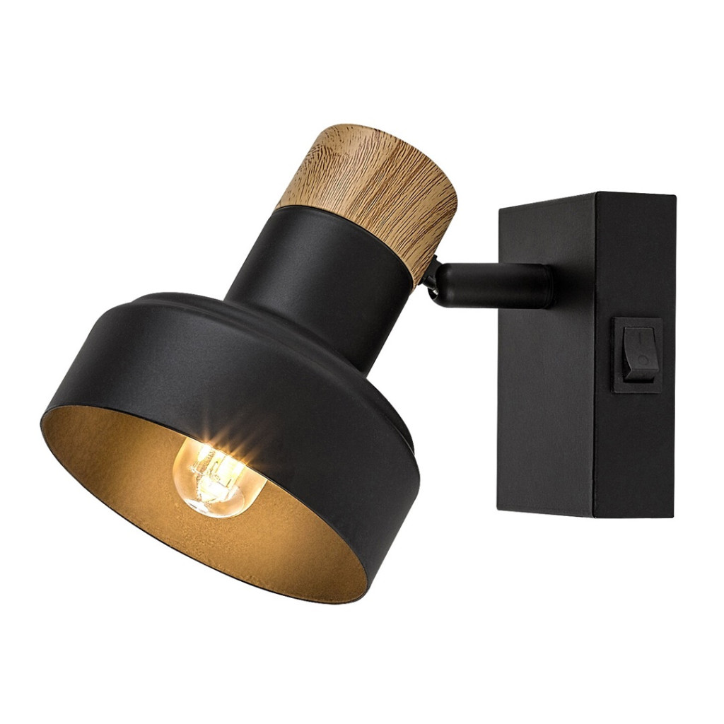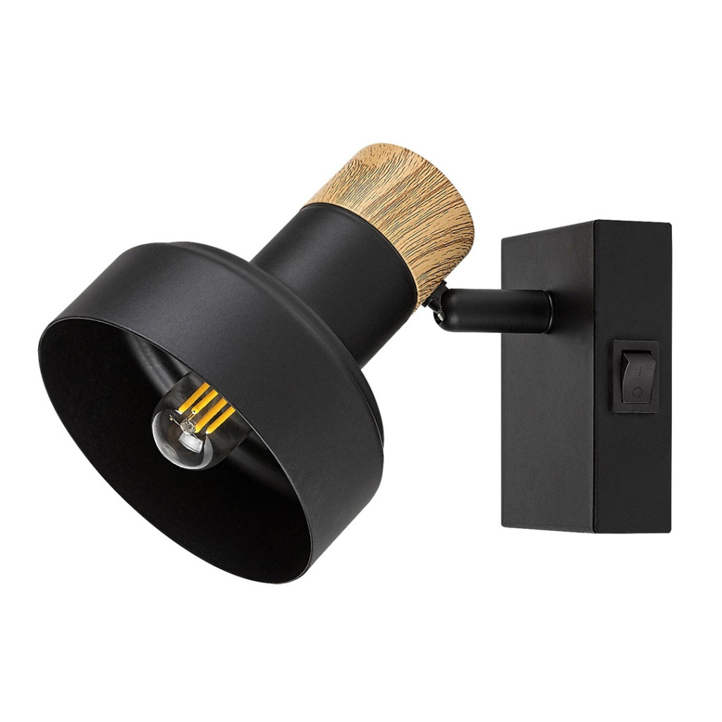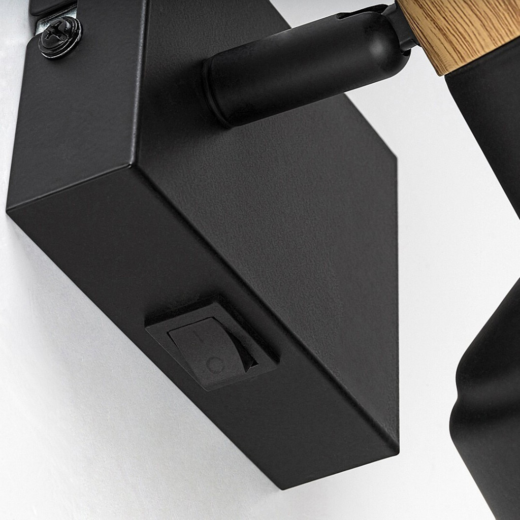 Fekete színű fém spot lámpa tölgy betéttel, billenthető fejjel, E14-es foglalattal, a fali elem oldalán kapcsolóval.