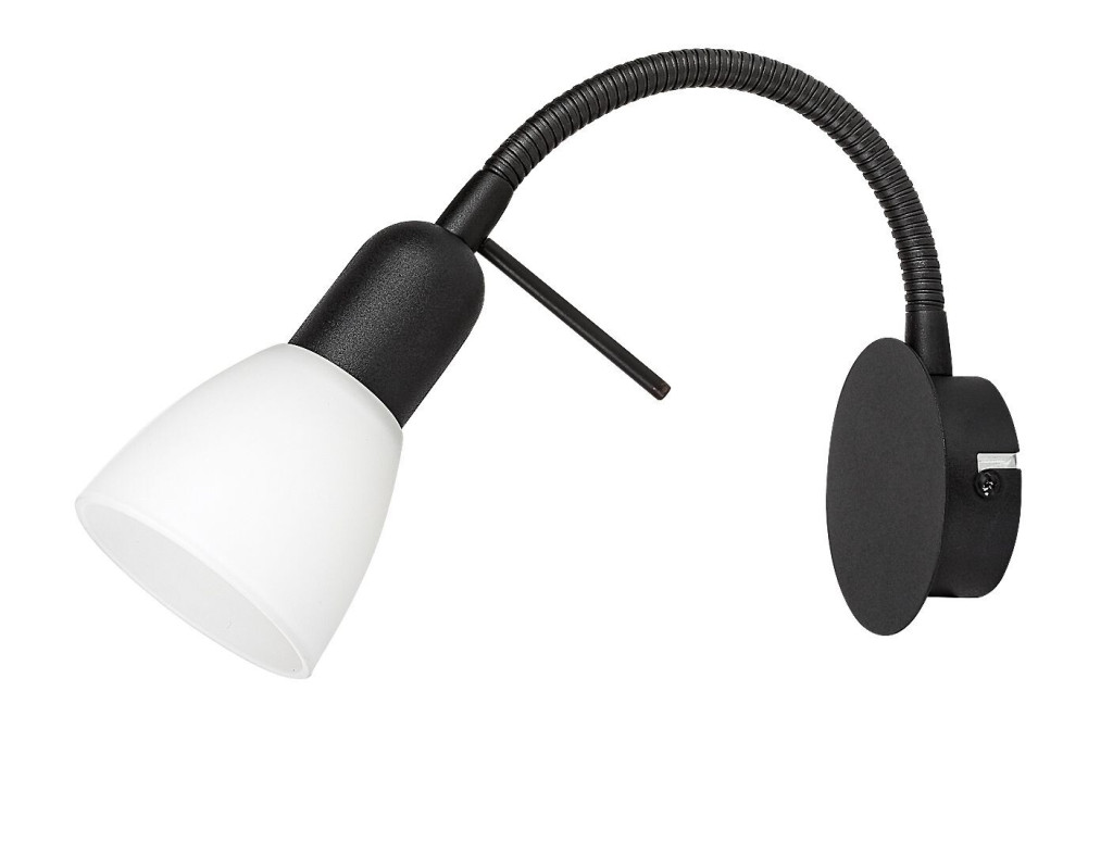 Fekete színű fém spot lámpa fehér színű üveg búrával, flexibilis karral, E14-es foglalattal.
