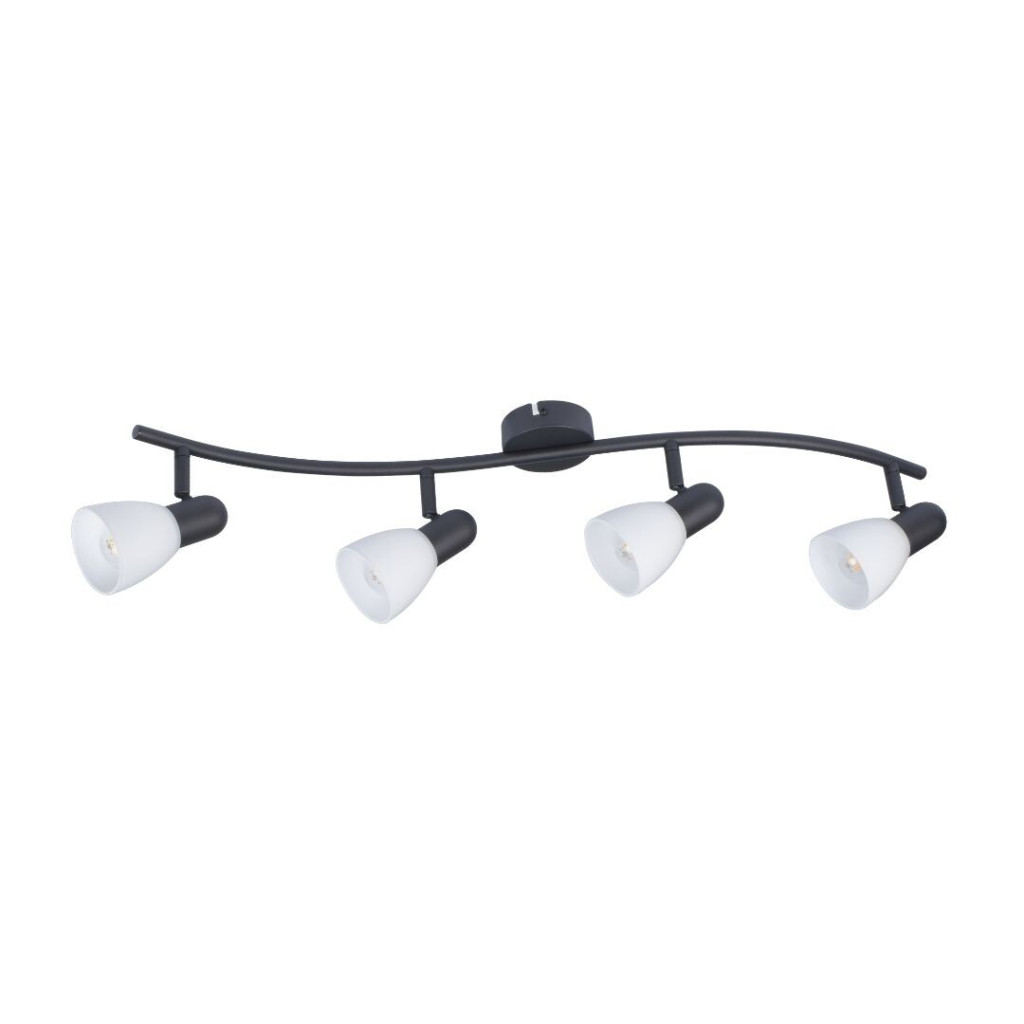 Fekete színű fém spot lámpa fehér színű üveg búrával, billenthető fejjel, E14-es foglalattal.