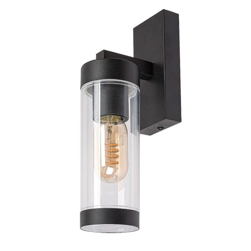 Fekete színű fém kültéri fali lámpa átlátszó műanyag búrával, 1db E27-es foglalattal, IP44-es védelemmel. A lámpát fényforrás nélkül szállítjuk.