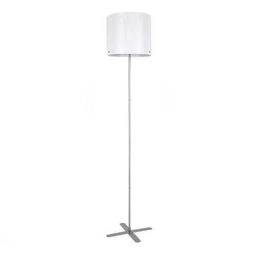 Ezüst színű fém álló lámpa fehér színű műanyag búrával, 1db E27-es foglalattal, vezetékre szerelt kapcsolóval.