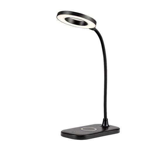 Matt fekete színű műanyag íróasztali lámpa beépített LED fényforrással, állítható fejjel. A lámpa fényereje és színhőmérséklete érintéssel változtatható. A lámpa továbbá USB aljzattal és vezeték nélküli töltő funkcióval is rendelkezik (csak az arra alkalamas mobiltelefonokat tudja tölteni).