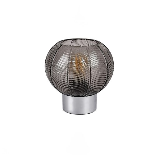 Króm színű fém vázas asztali lámpa mintás, füstös üveg búrával, E27-es foglalattal, vezetékre szerelt kapcsolóval. A lámpát fényforrás nélkül szállítjuk.