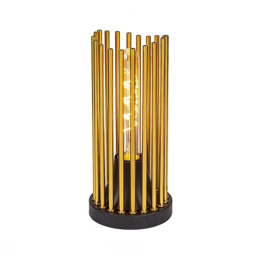Matt fekete színű fém asztali lámpa sárgaréz színű fém csövecskékből álló búrával, E27-es foglalattal, vezetékre szerelt kapcsolóval.