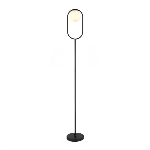 Fekete színű fém vázas álló lámpa gömb alakú opál üveg búrával, E27-es foglalattal, vezetékre szerelt kapcsolóval.