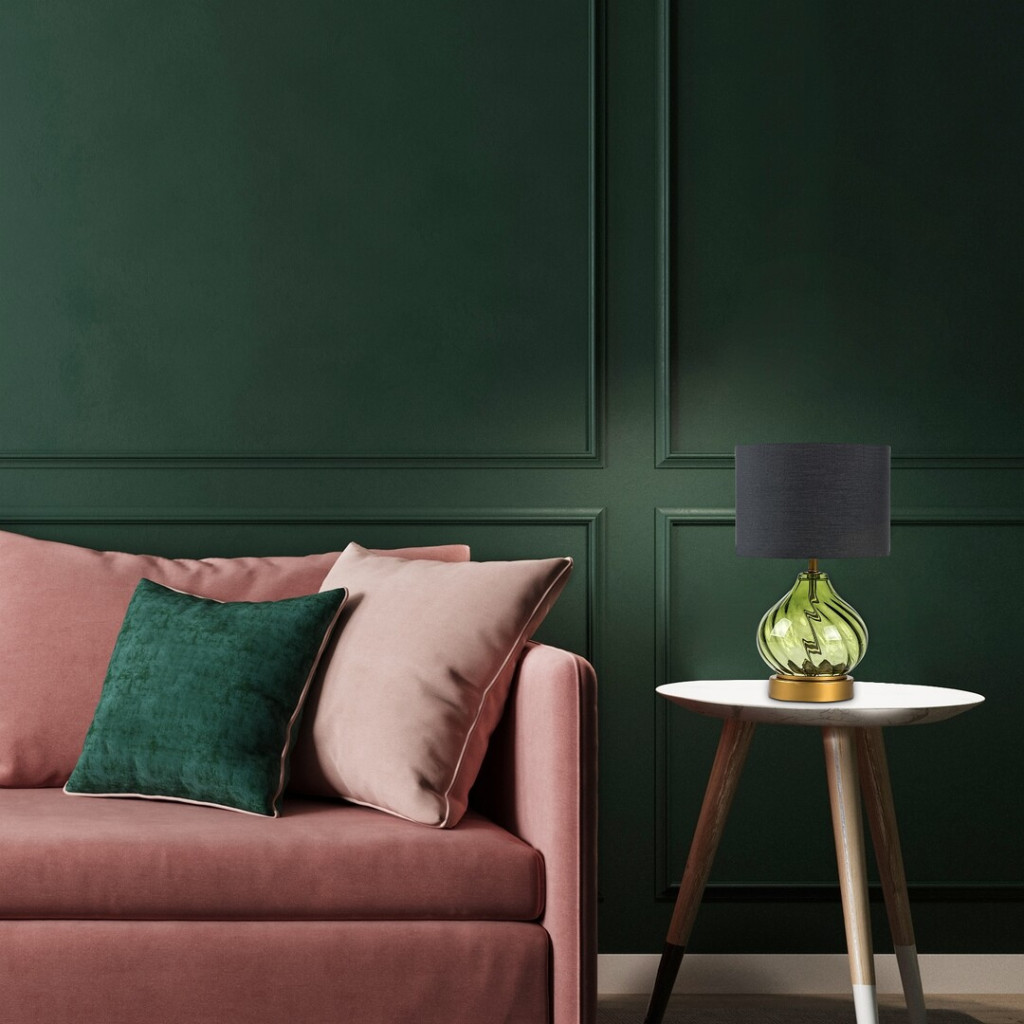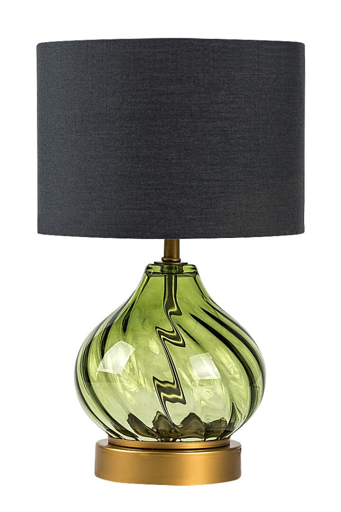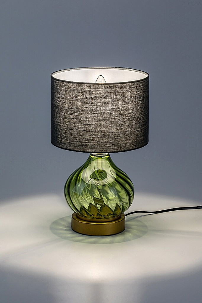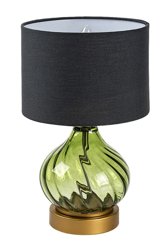 Arany színű fém és zöld színű üveg talpas asztali lámpa fekete színű textil búrával, E14-es fényforrással, vezetékre szerelt kapcsolóval.
