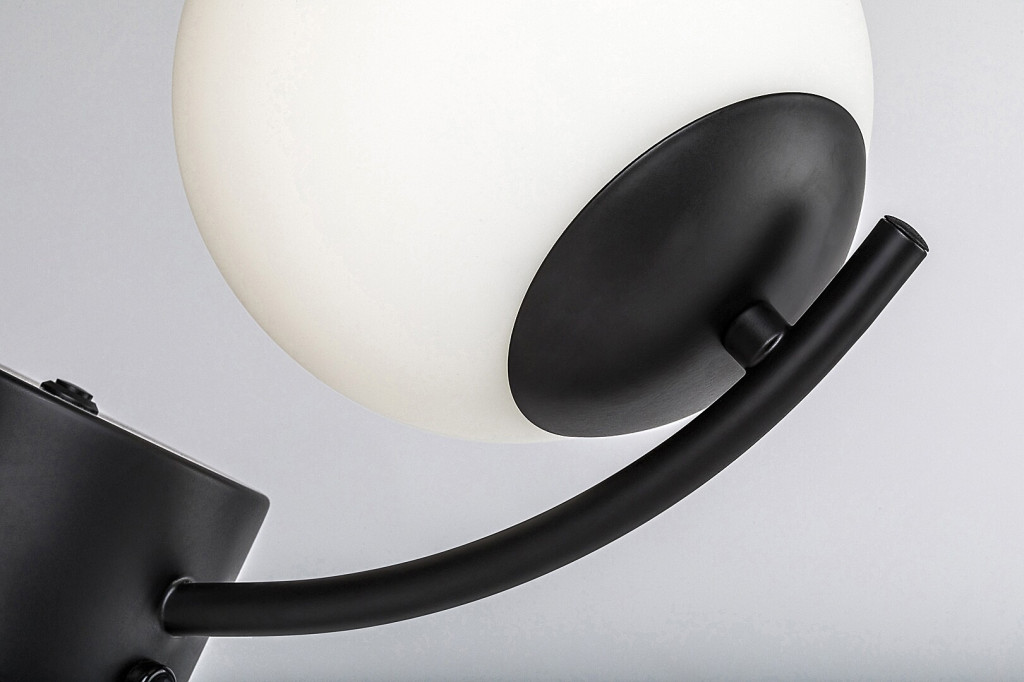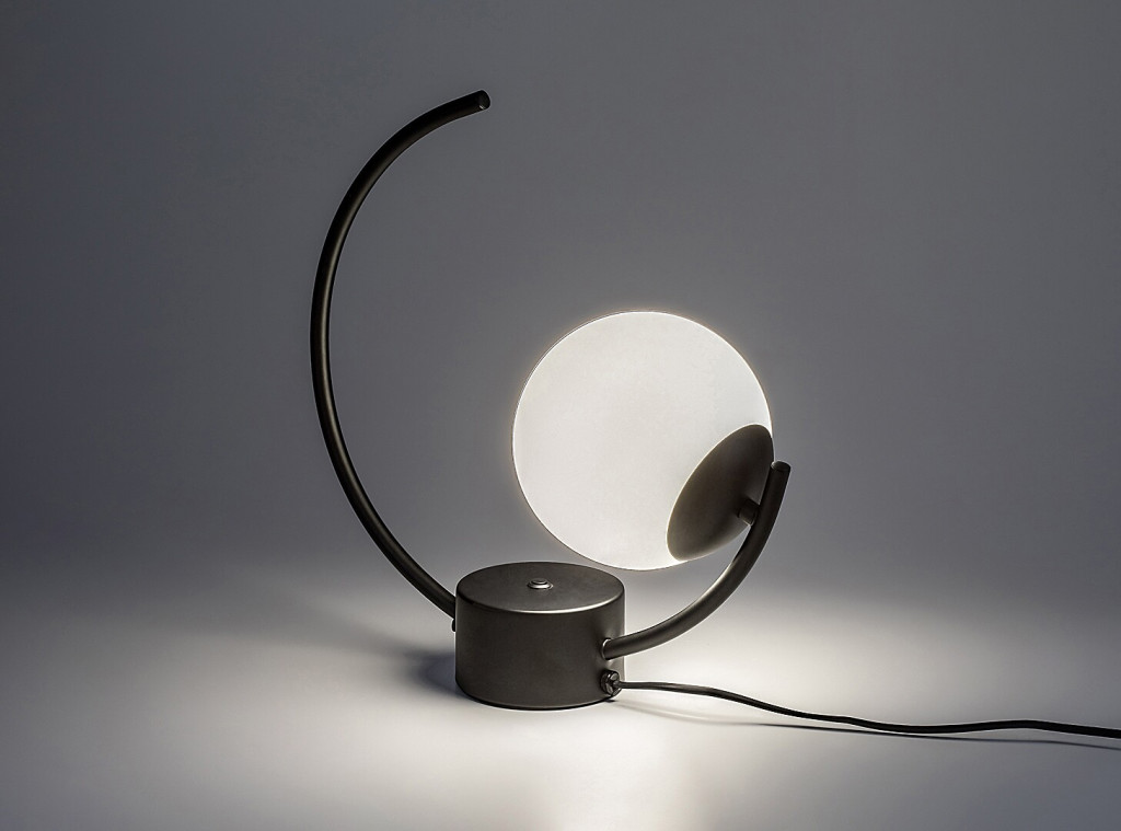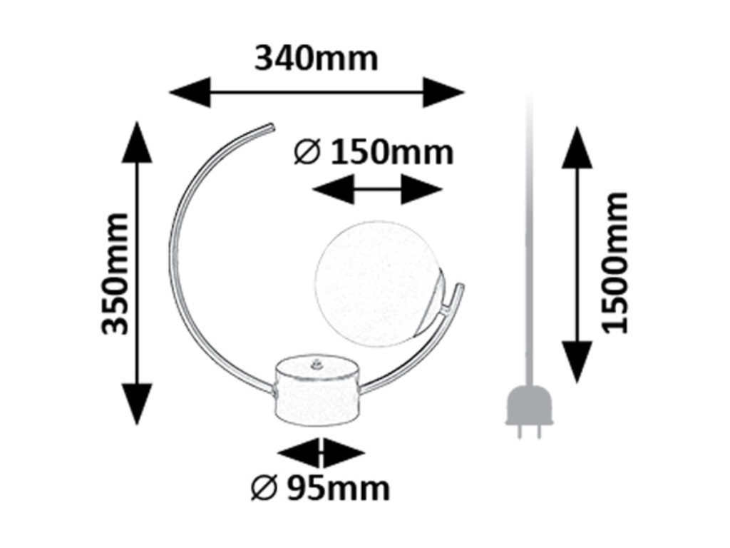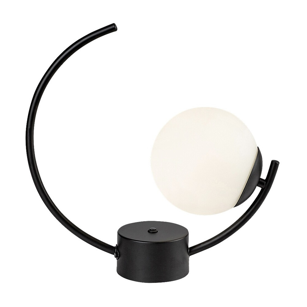 Fekete színű fém vázas asztali lámpa fehér színű üveg búrával, E14-es foglalattal, a lámpatesten kapcsolóval.