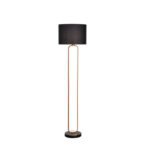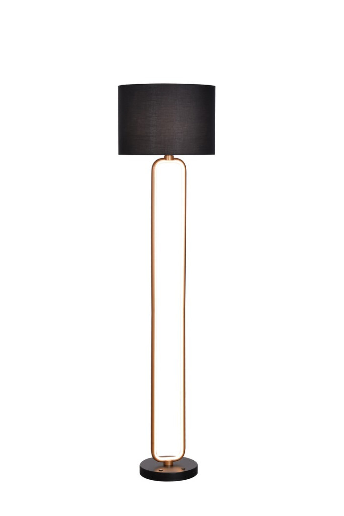 Arany színű fém vázas álló lámpa fekete színű textil bevonatos PVC búrával, kapcsolóval. A lámpatestben meleg fehér színhőmérsékletű beépített LED fényforrás kapott helyet, míg a lámpaernyő alatt E27-es foglalat található. A két fényforrás külön kapcsolható.